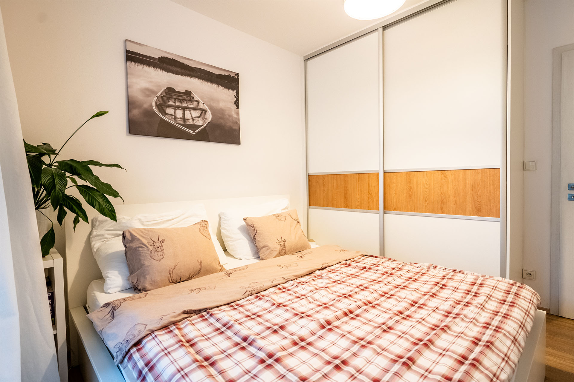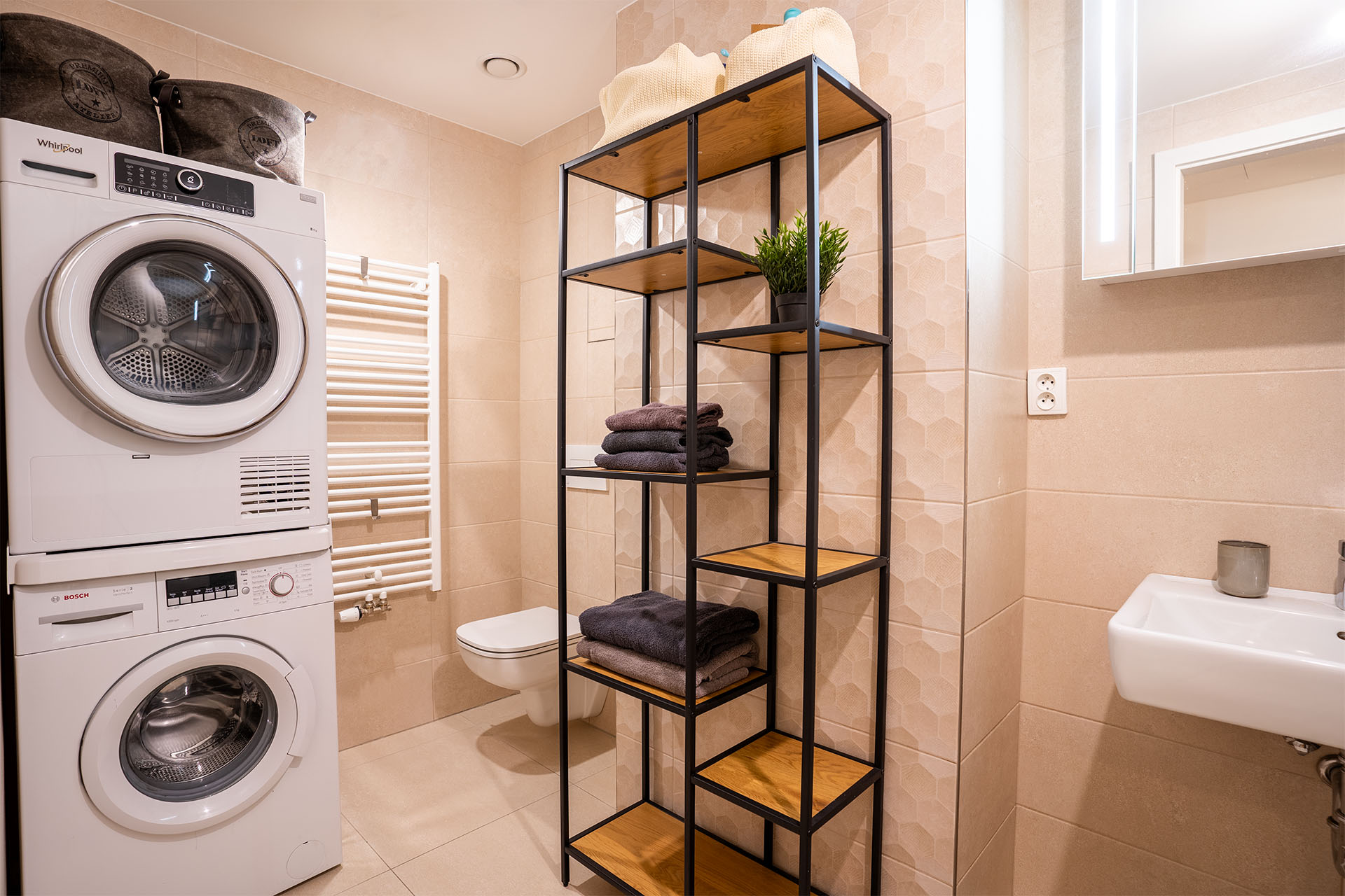 Ložnice jsou v bytě dvě a z obou máte přístup na terasu. V koupelně je vana a místo na pračku se sušičkou, toaleta je schovaná za rohem.