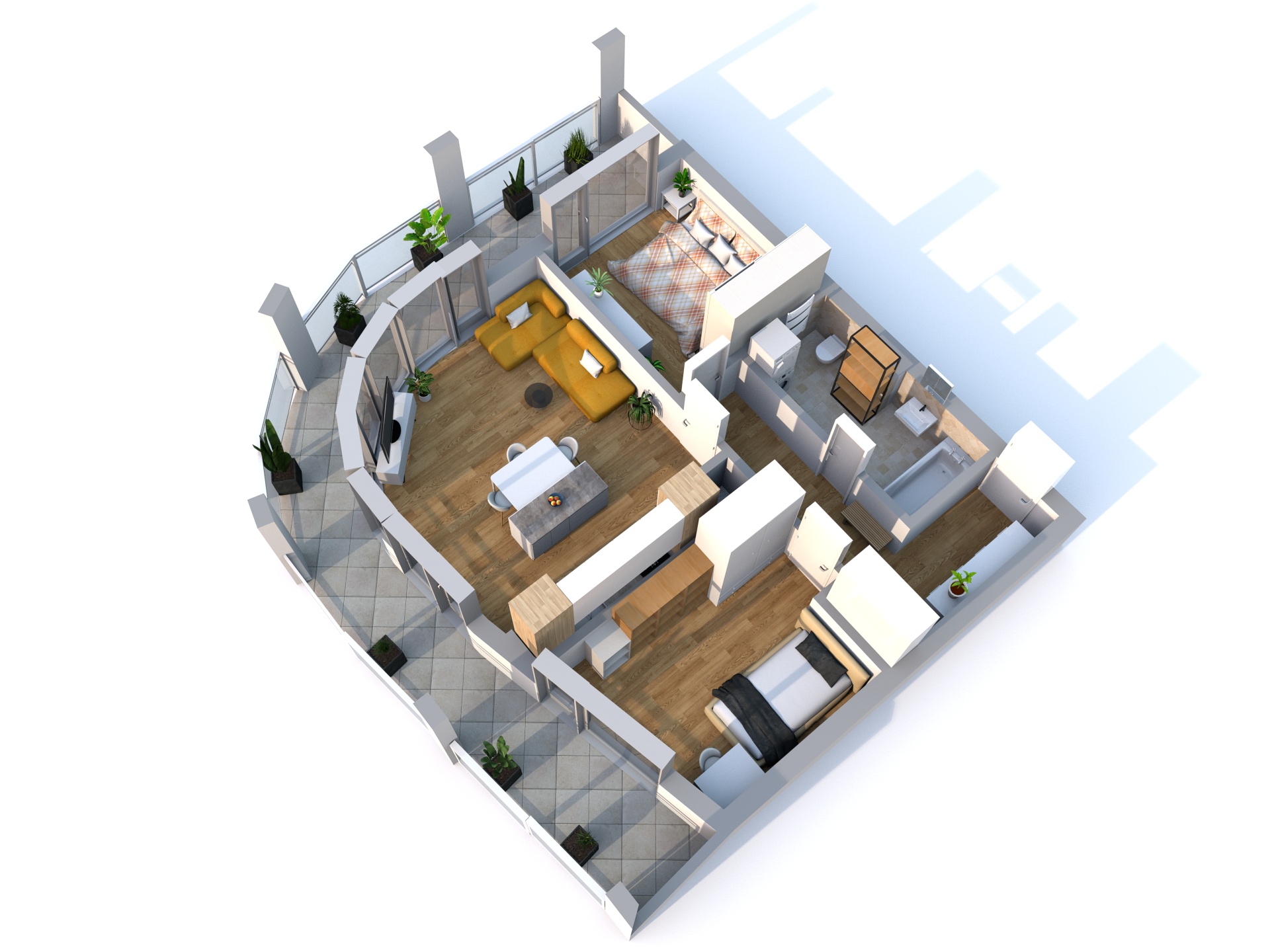 Byt má dispozici 3+kk a výměru 67 m². Je ve třetím patře nového bytového domu s výtahem a skládá se z obývacího pokoje s kuchyní, dvou ložnic, koupelny s WC a velké terasy. K bytu patří kryté stání a sklep.