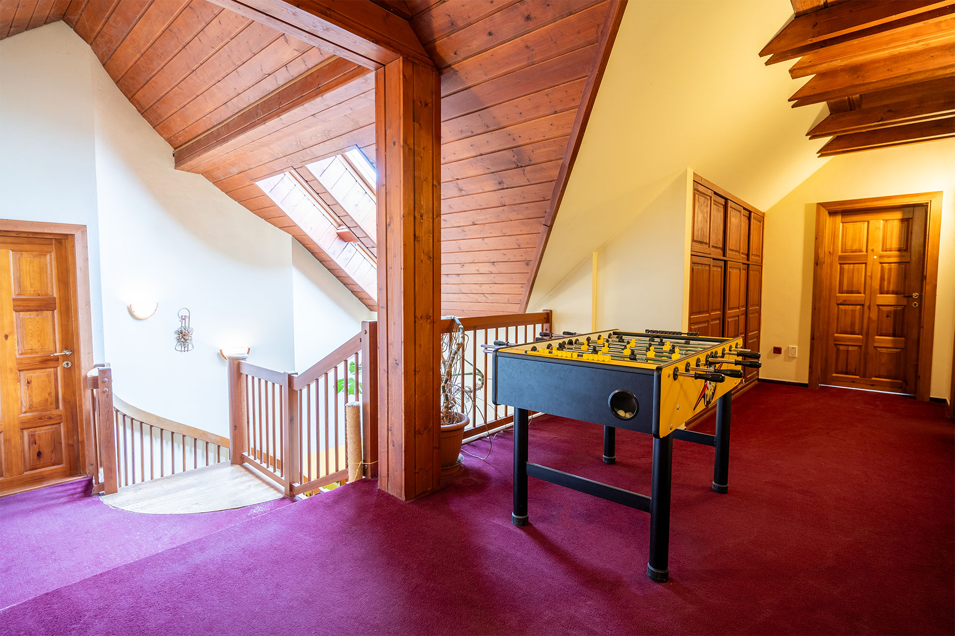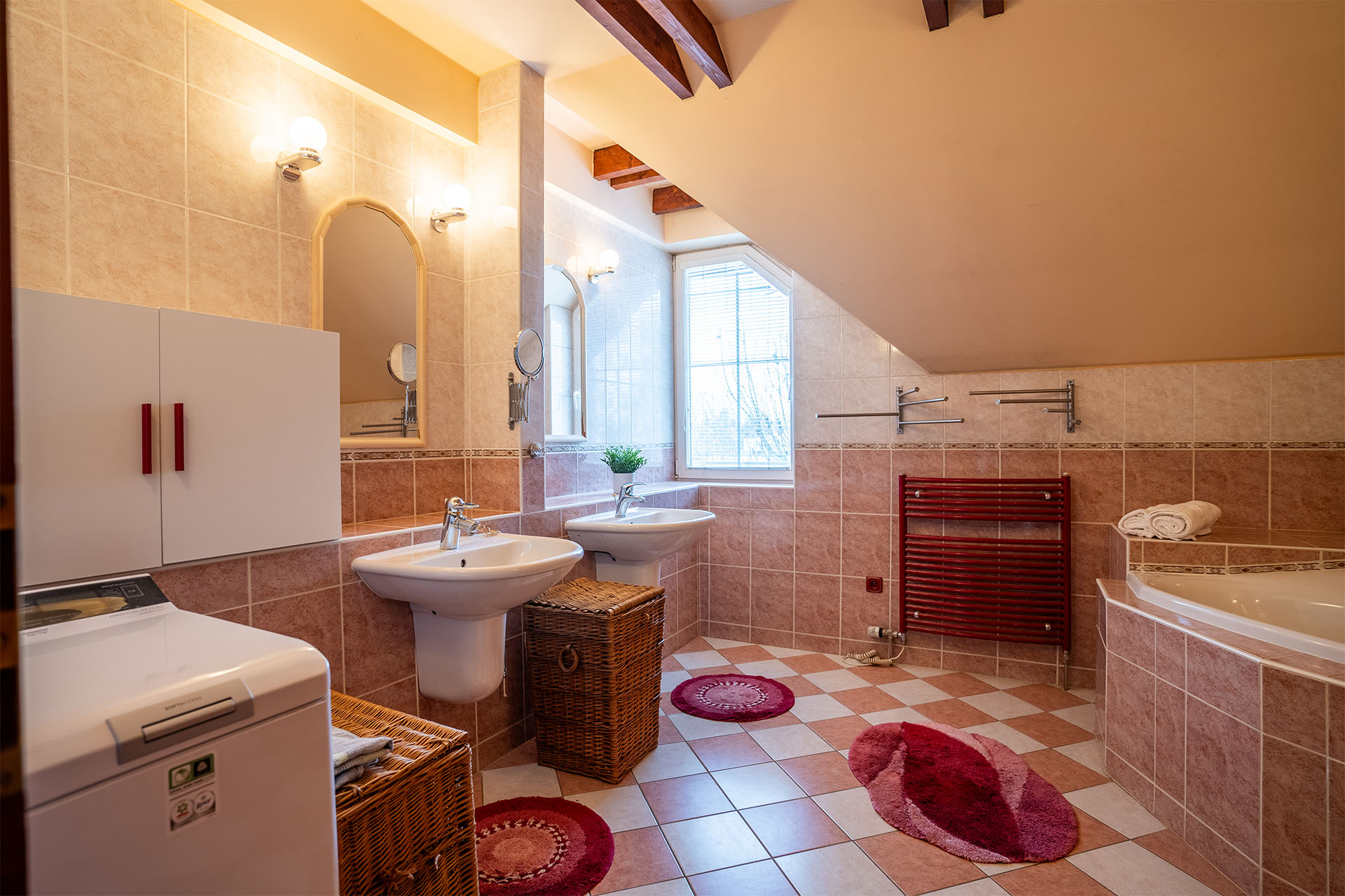 Z haly vystoupáte po točitém schodišti do patra, kde jsou 3 ložnice a druhá koupelna s rohovou vanou a sprchou i samostatné WC. V patře jsou také dvě komory.